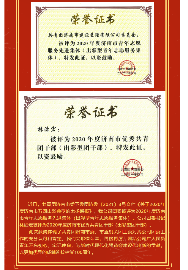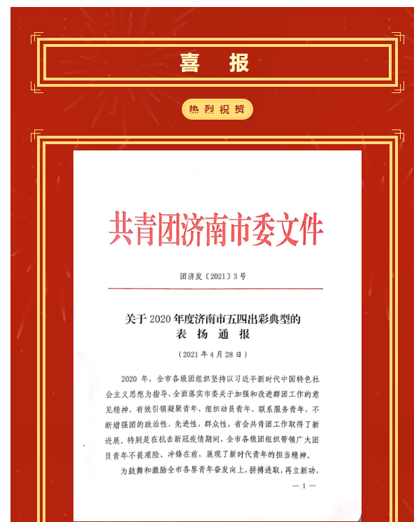 珍惜榮譽(yù) 砥礪前行——公司團(tuán)委在2020年度濟(jì)南市五四出彩典型評選中榮獲兩項(xiàng)榮譽(yù)